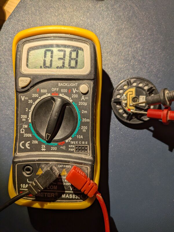 - Use a multimeter to test the speaker resistance (working speaker should show 38 ohms)